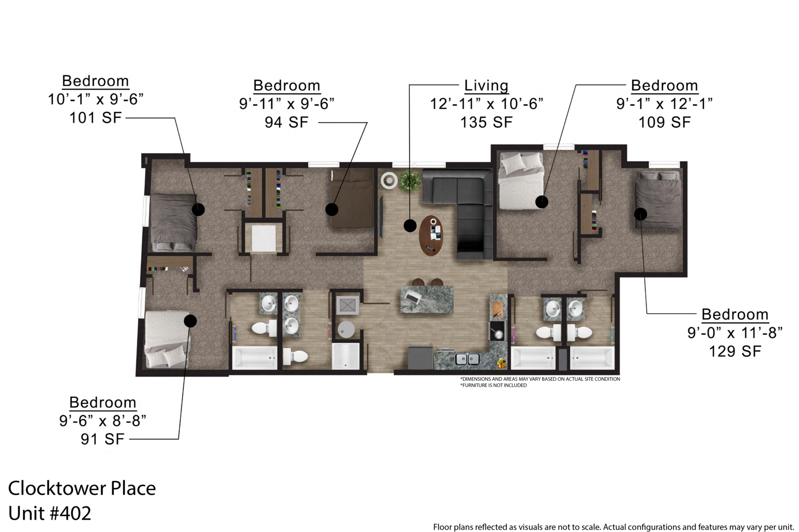 Welcome to Clocktower Place—modern living in a prime Ames location. This 5 bedroom, 4 bathroom apartment features a spacious, thoughtfully designed layout, high-end finishes, and includes a 55" TV for your enjoyment. Located near Iowa State University, local dining, and shopping, Clocktower Place offers the perfect blend of comfort and convenience.